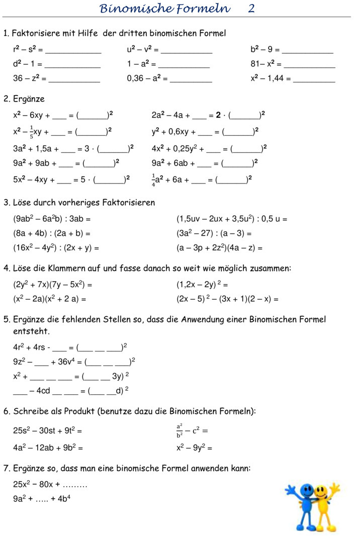 Binomische Formeln Arbeitsblatt 3120 Binomische formeln, Nachhilfe mathe, Mathe formeln