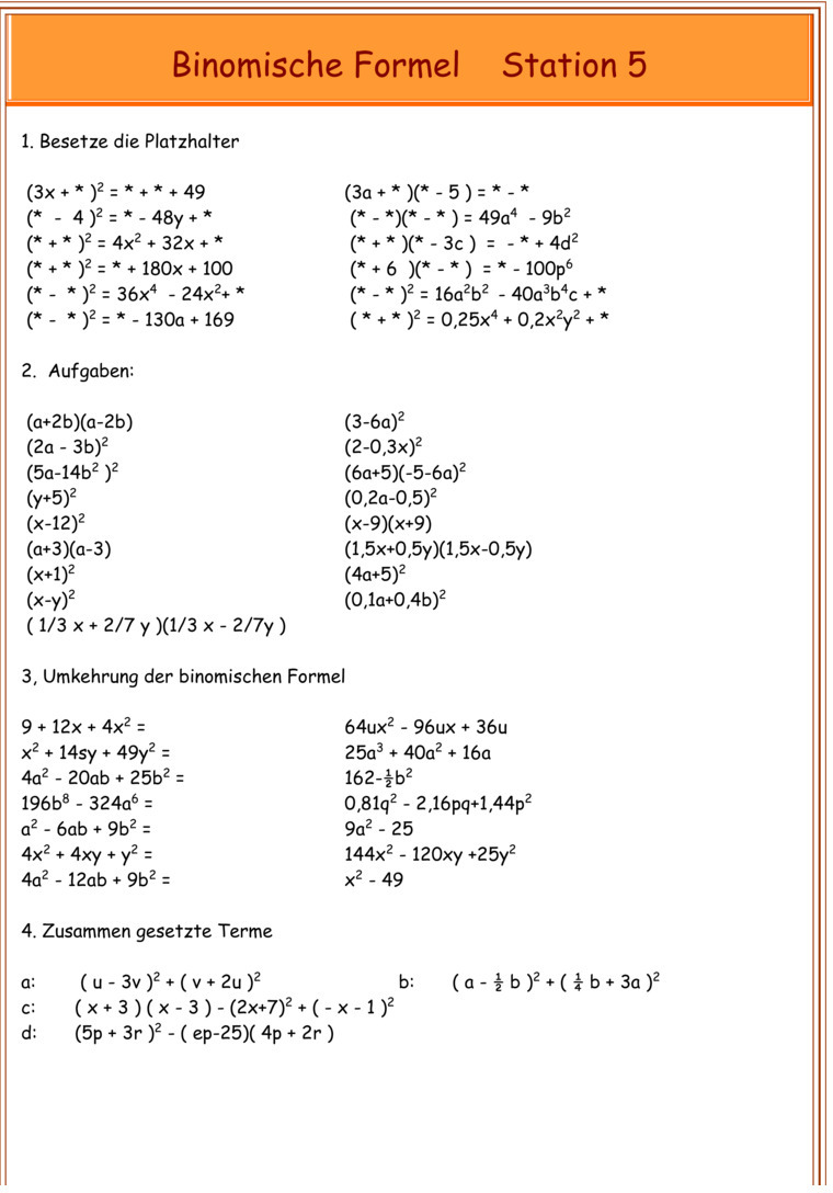 Übungsblatt mit Musterlösung zu Binomische Formeln, Binomische Formeln; Station 1 bis 5; Aufgabensammlung.
