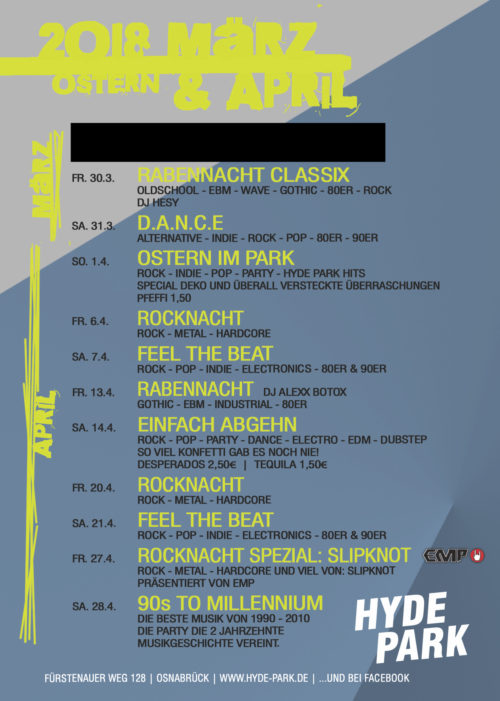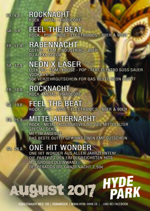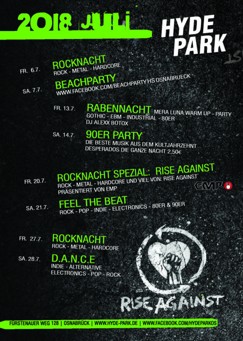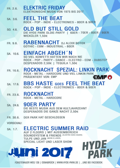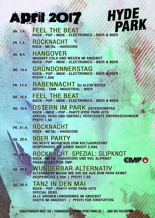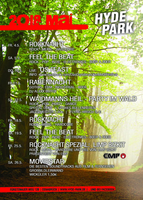 Im Hyde Park finden zusätzlich zu Parties und Clubbetrieb regelmäßig Konzerte statt - von Gothic, Rockmusik, Elektro, Pop, 90er-Jahre bis in die Charts. Seit 1976 gibt es den traditionsreichen Musikclub Hyde Park in Osnabrück.. Adresse & Kontakt. Hyde Park Fürstenauer Weg 128 49090 Osnabrück Deutschland. Weitere Orte