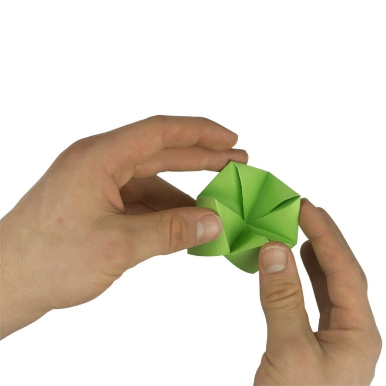 1. Horizontal und vertikal falten und wieder entfalten. 2. Diagonal falten und wieder entfalten. 3. Alle vier Ecken zur Mitte falten. 4. Das Quadrat wenden. 5. Noch ein mal alle vier Ecken zur Mitte falten. 6. Die untere Hälfte nach oben falten. 7. Von unten mit den Fingern in die vier Taschen greifen und das Modell dabei dreidimensional ausformen.