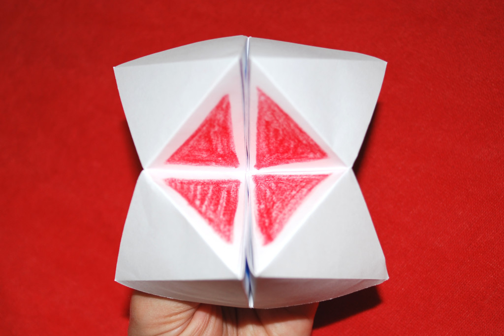 Origami Gegenstände falten - Himmel und Hoelle für Kinder. Faltanleitung: Origami Himmel und Hölle. Material: quadratisches (farbiges) Blatt Papier (für Erwachsene wegen Fingergröße ca. 20x20 cm großes Blatt empfohlen, für Kinder schon ab 10x10 cm) Anforderungsstufe: sehr leicht. Zeitaufwand: ein paar Minuten.